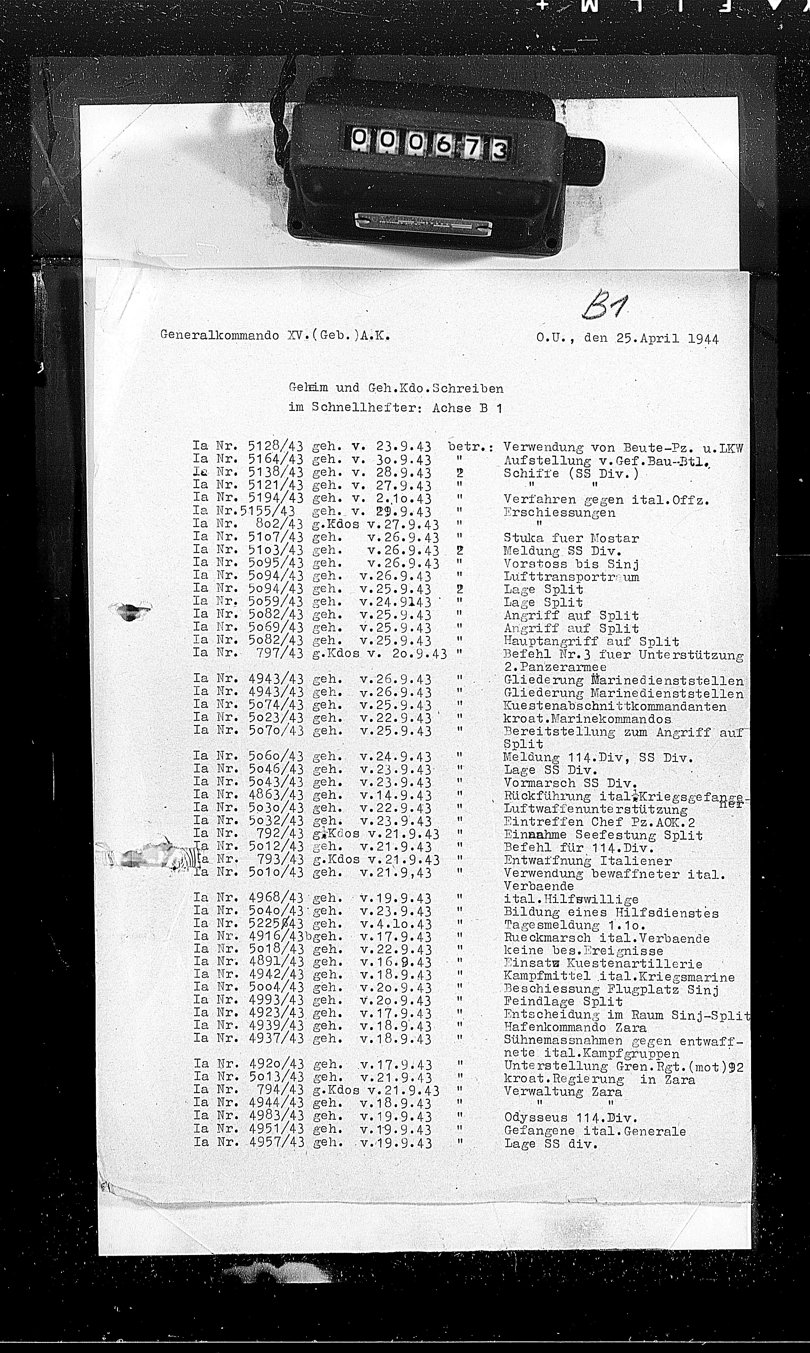 - Broj i vrsta vozila zaplijenjenih od Italijana i njihova raspodjela (uglavnom 7.SS divizija); ukupno zarobljeno 37 ispravnih i 13 neispravnih *manjih tenkova*, i 8 velikih i 3 malih borbenih vozila (*neka su već izgubljena u borbama*) ; 300 kamiona i automobila, od čega samo 70 ispravnih. (frame no. 679)