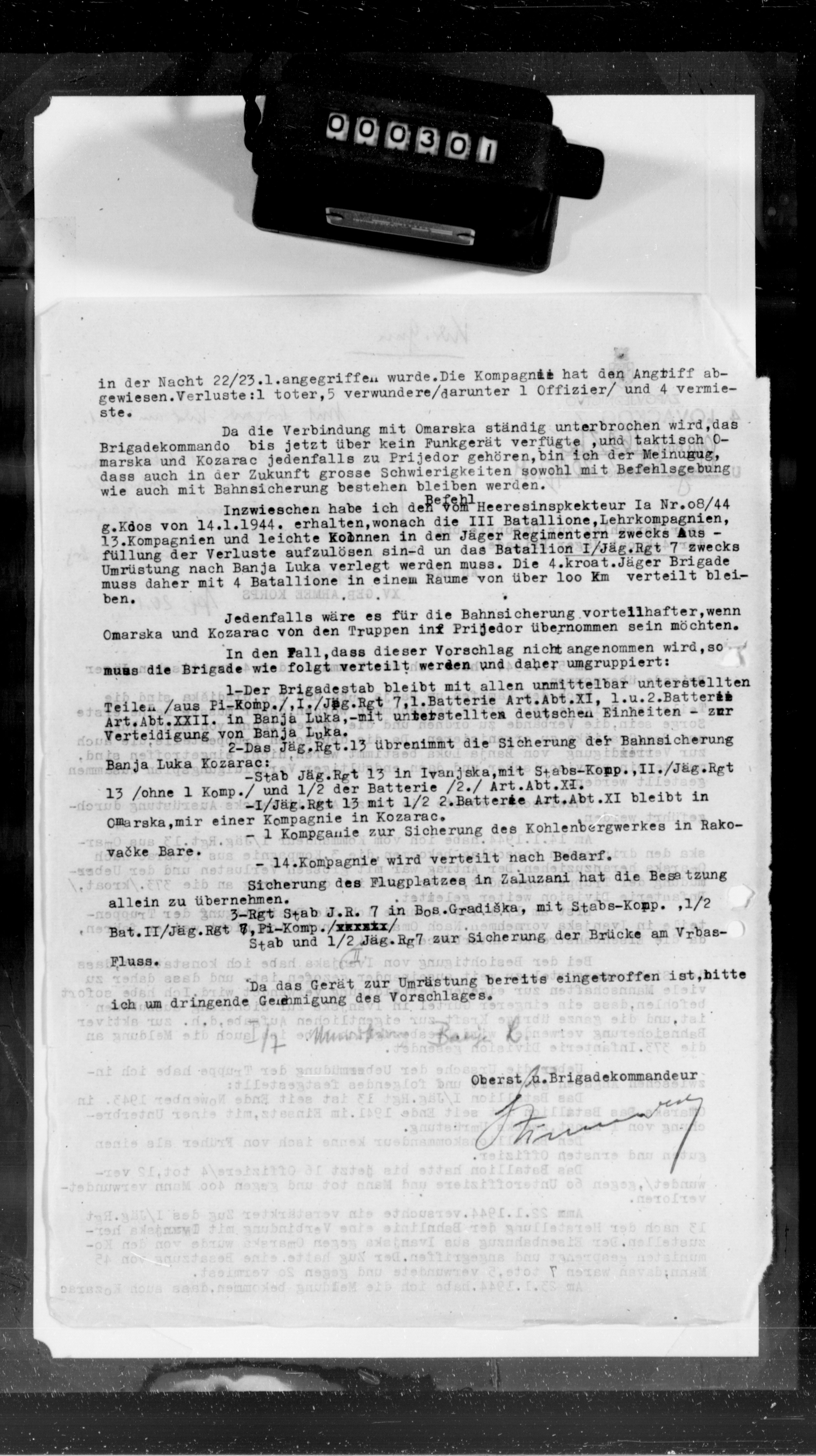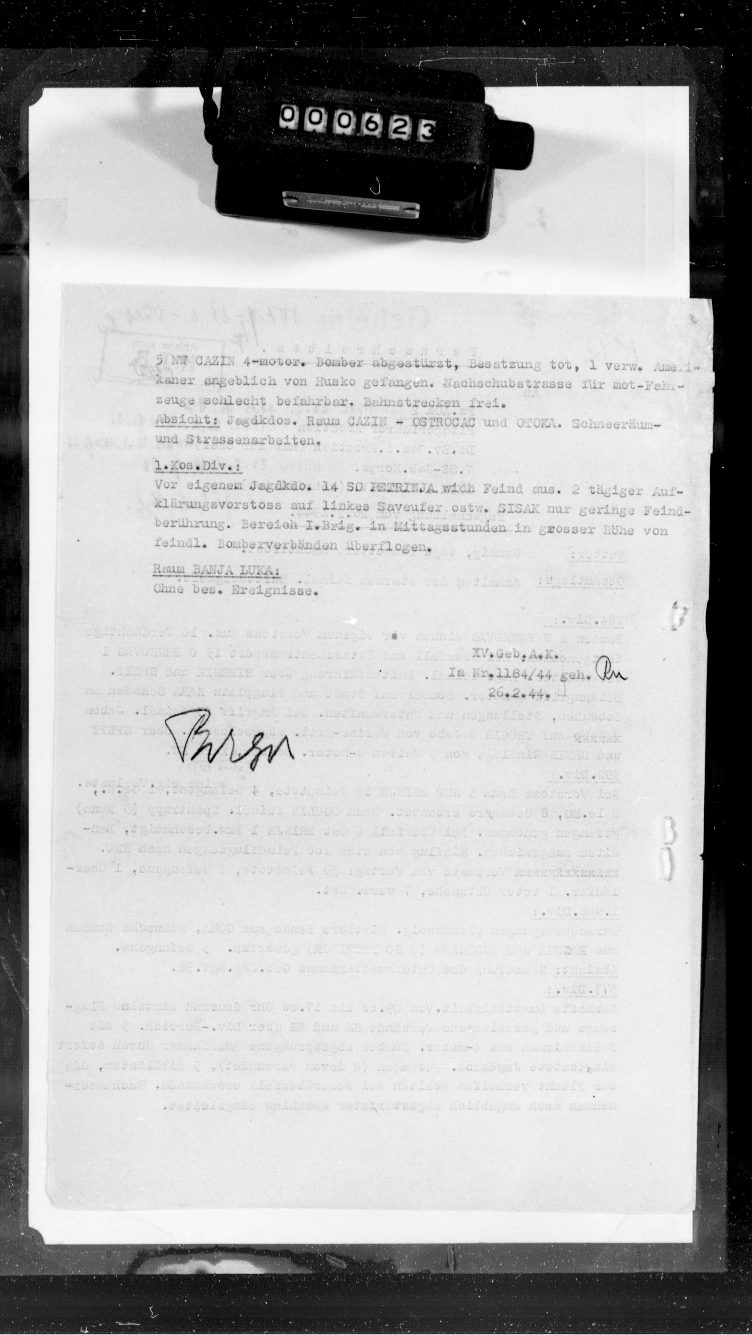 Geb AK XV, 58277/4, KTB Anlagen - Tactical information on operations at Plavna, guerrilla warfare, the defense of Banja Luka, the employment of the 1st Cossack Division and reports evaluating the enemy situation., January 01, 1944 - January 31, 1944 izdvojeno: | 321 |
