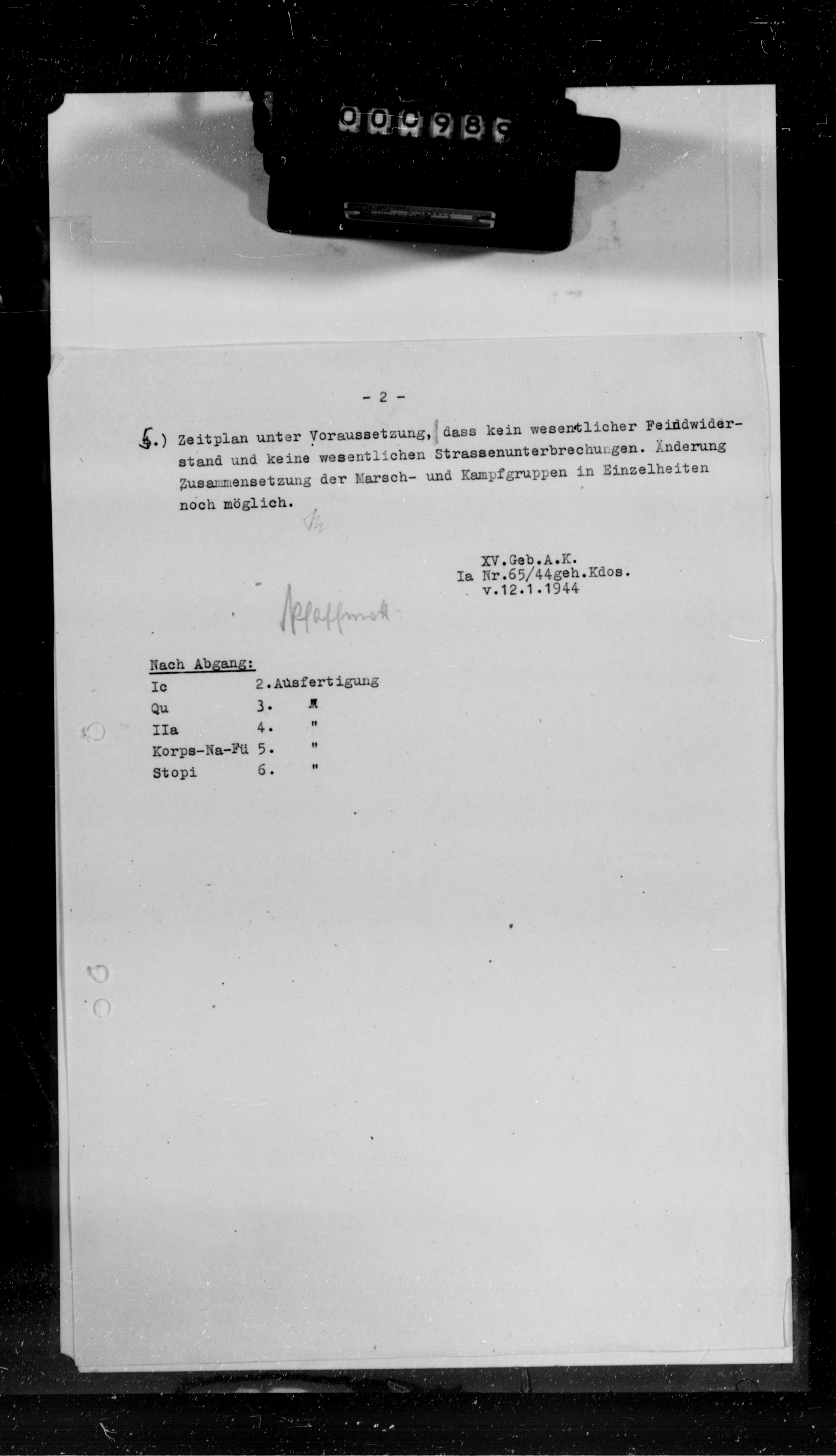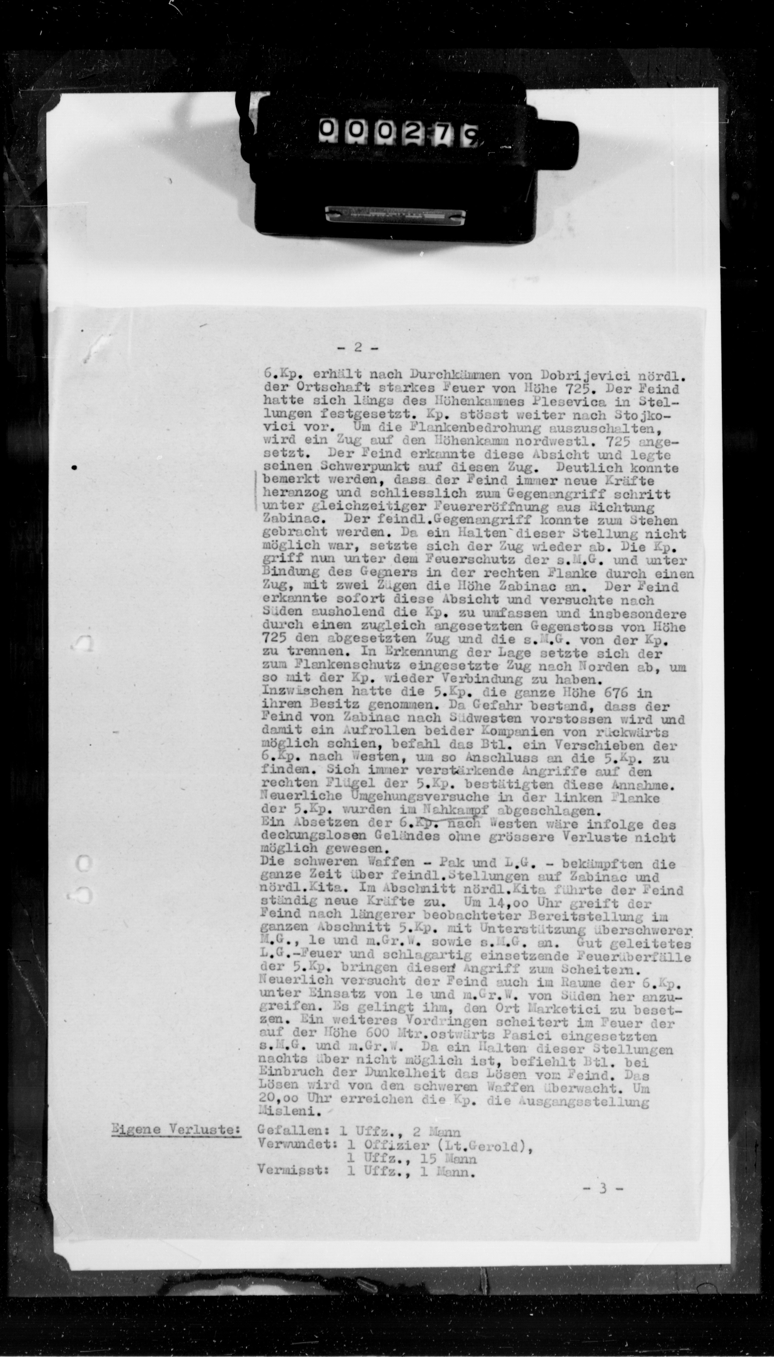 - Dnevni izveštaj, 1.3.44. 1. brdska divizija: Marševski pokret prema planu, poslednja marševska grupa napustila Bihać 1.3. Bande na mestu napada j. od Divuše odbačene na istok. 40 ranjenih, 39 naših poginulih i 20 onih koji nisu ranjeni zbrinuti. Transportno vozilo i. od Bos. Novog naišlo na minu, 6 naših mrtvo, 1 ranjen, vozilo uništeno. Dodatak izveštaju od 28.2: 8 sopstvenih poginulih, 20 ranjenih, 2 nestala. (frame no. 3)
