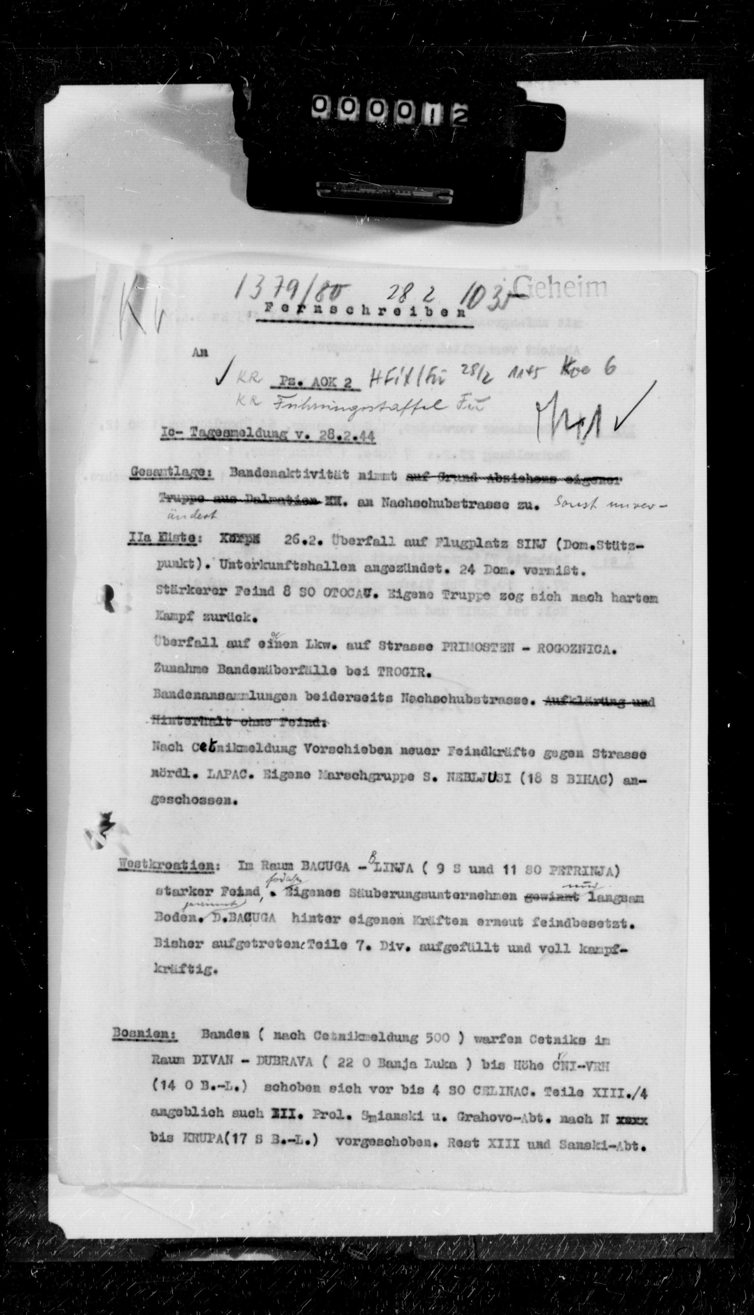 Geb AK XV, 58278/2 Ic, Tätigkeitsbericht - Report compiled by the G-2 Section (Abtl.Ic) discloses detailed information on intelligence activities in connection with military operations near Agram, Karlovac, Ogulin, Josipdol, Senj, Novi, Bruvno (Dalmatia), Sibenik, and Trogir against enemy guerrila bands, also on enemy and own propaganda actions, counterintelligence activities, and political developments during the German campaign in Croatia., February 01, 1944 - February 29, 1944