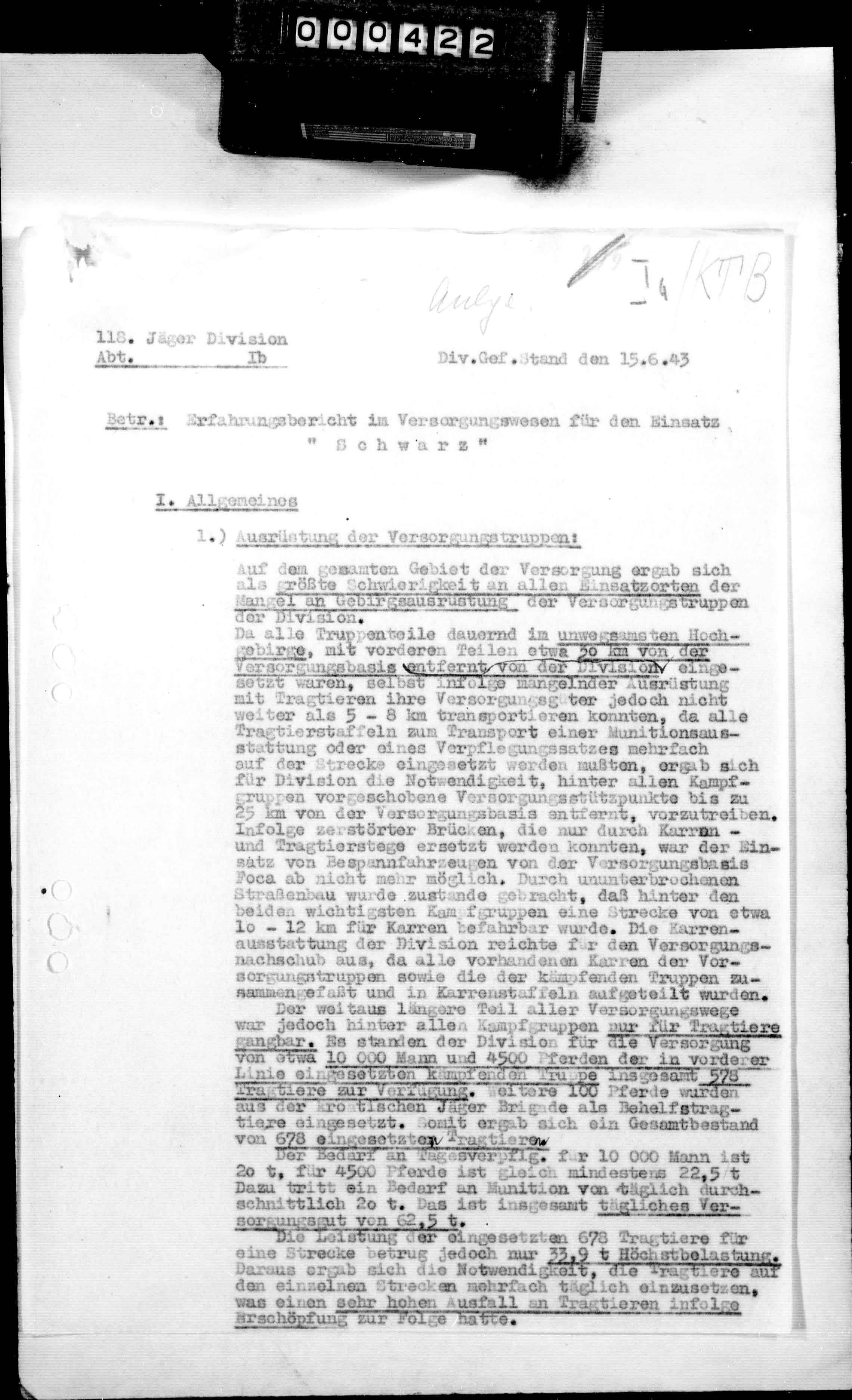 118.JgD, Anlagen zum KTB. 1943-06-30 - Combat against partisan units; tactical situation in Herzegovina and Bosnia; and assembly in the Ustikolina, Foca, Jelec, and Osiiecani areas for transfer to Montenegro after completion of Operation Schwarz; organization and activities of Gruppe Gertler, Sruppe Annacker, Gruppe Tribukait, and Gruppe Hentschel and the 4. kroatische Jg. Brigade; and the general political, military, transportation, supply, economic, and replacement situation in Yugoslavia. Afteraction reports concerning combat operations 27 May-18 Jun 1943, and critiques relating to Operation Schwarz; casualty reports; order-of-battle charts; and intelligence reports and bulletins pertaining to partisan activity, losses, and tactical situation and to counterintelligence activity., June 01, 1943 - June 30, 1943