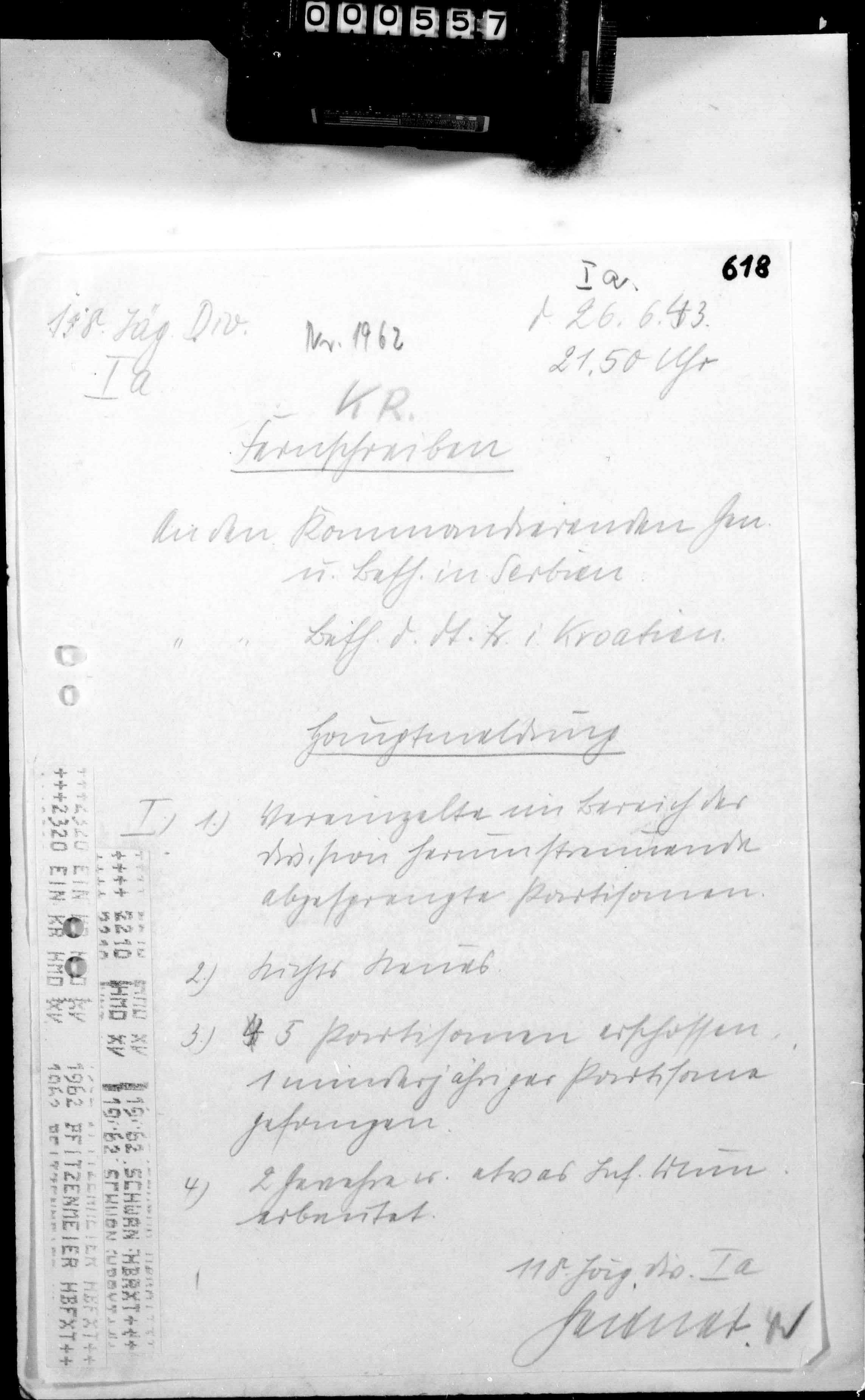 - Naređenje za privođenje svih vojnosposobnih muškaraca iz prostora južno od linije Vrbnica-Beleni-Klinci-Rijeka u logor u Foči na dan 9.6.43; puštati samo one koji mogu dokazati da nemaju baš nikakve veze s partizanima; ostale nadgledati, a Ic će se njima detaljnije pozabaviti; -Bez prestupa i maltretiranja!- [zadnja riječ dopisana olovkom]. (frame no. 208)