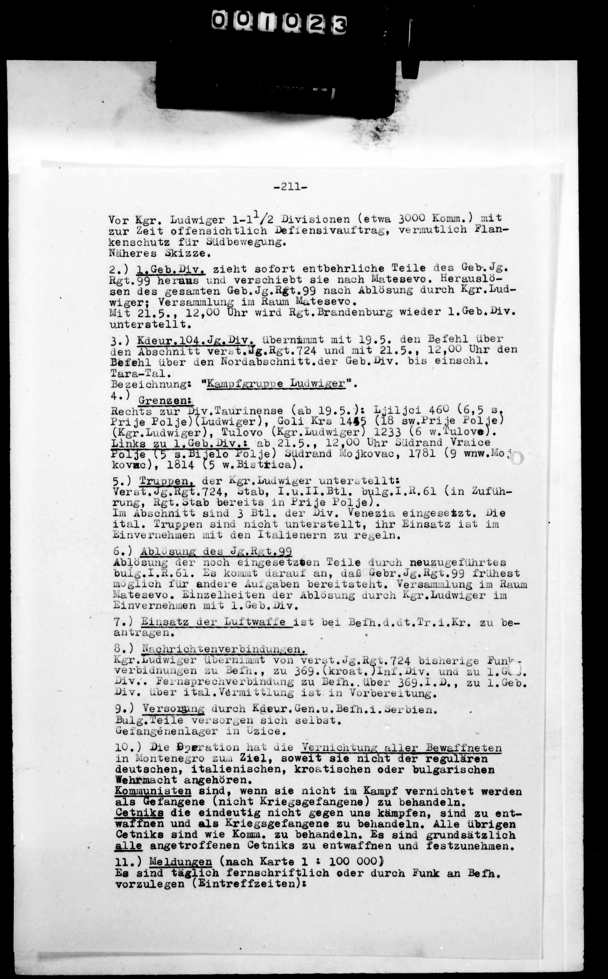 34404/5 - Ic, TB mit Anlagen. - Activity report concerning partisan attacks, raids, acts of sabotage, strength, movements, location, unit identification, and losses; counterintelligence; military intelligence; and troop indoctrination and entertainment. German and enemy propaganda leaflets; reports regarding the mission and commitment of the Geheime Feldpolizei (secret field police) and Croatian police, and a meeting with Chetnik leaders Kovacevic, Cvijetan Todic, Djukanovic Mirko, Milic Milan, and Vladimir Petrovic; translations of partisan service regulation and combat methods; instructions for treatment of captured partisans; notes on Tito-s life; interrogation summaries; and periodic intelligence reports and bulletins. Jan 01 - Mar 31, 1943., July 01, 1943 - November 30, -0001 izdvojeno: | 1223 |