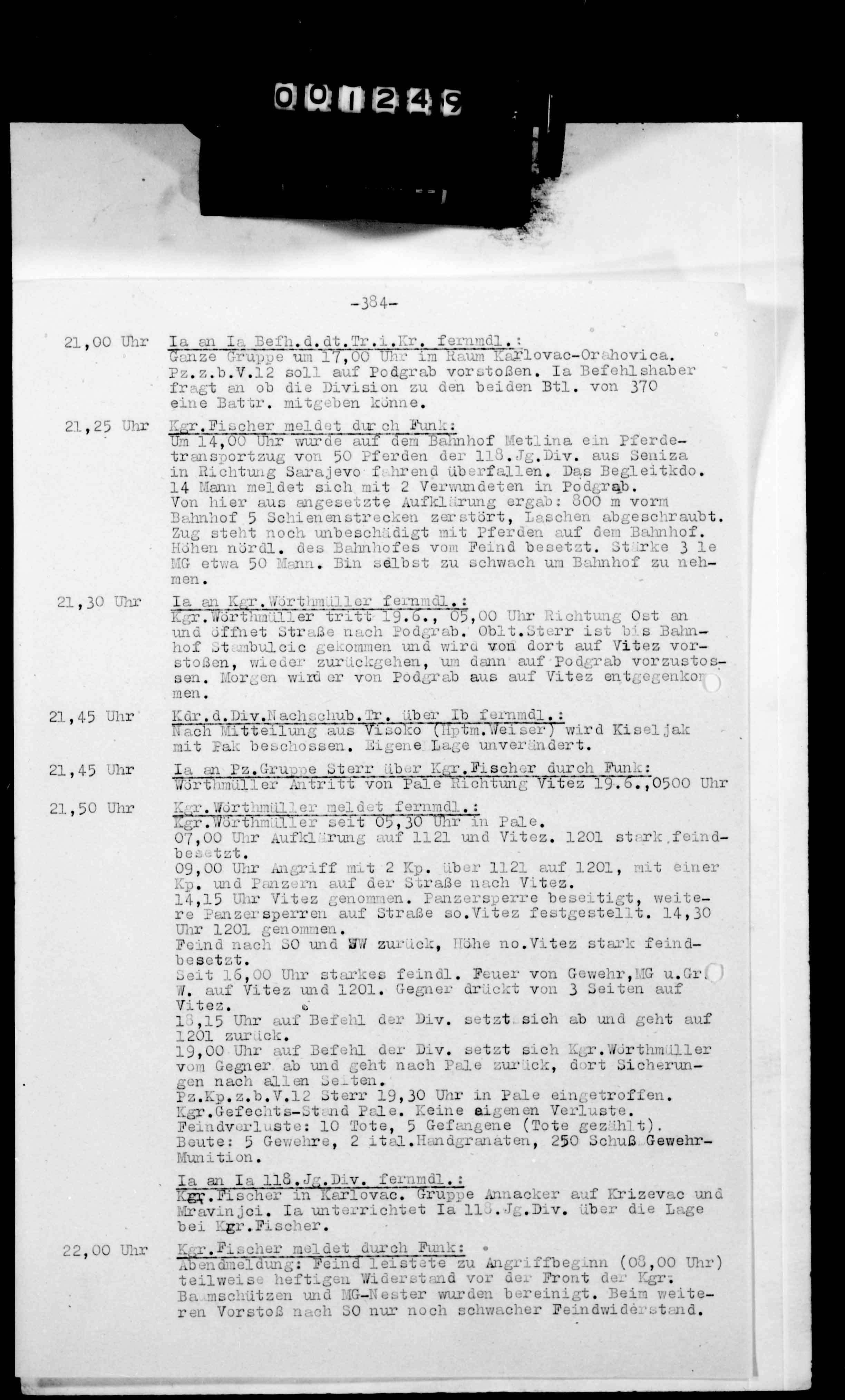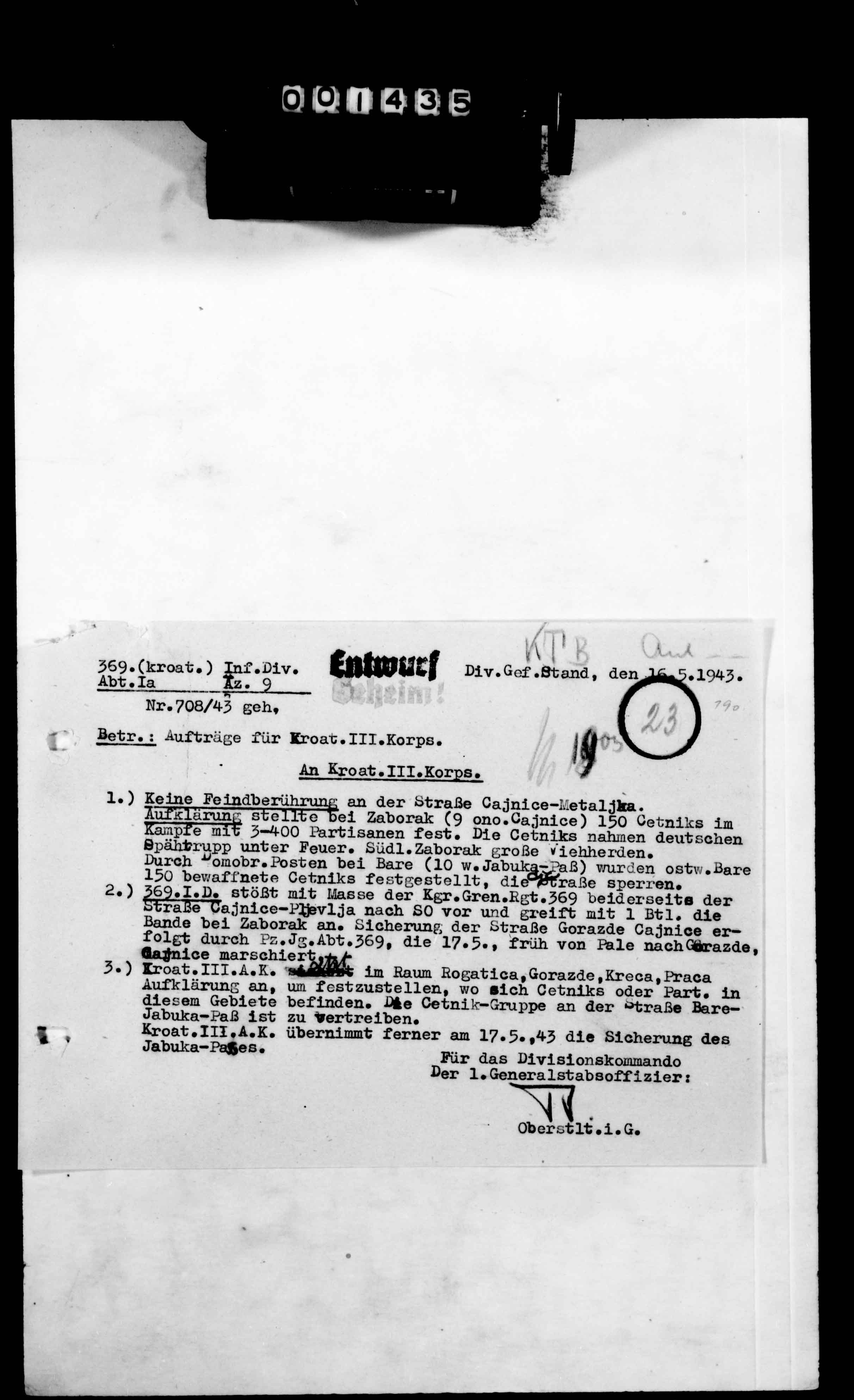 34404/2 - Ia, Anlagenband XXVI zum KTB 3. - Orders, reports, messages, and overlays pertaining to operations against partisans (mostly Communist groups), reconnaissance and mopping-up action, security, laying and location of minefields, regrouping, and partisan activity in the Sarajevo, Jajce, Travnik, Zenica, Doboj, Visegrad, Teslic, Vares, Sekovici, Turbe, Donji Vakuf, Tuzla, Zavidovici, Busovaca, Zepce, Zvornik, and Derventa areas. Afteraction reports and critiques regarding Unternehmen Teslic I (operations against partisans in support of Unternehaen Weiss I in the Teslic area and mopping-up in the Teslic, Zavidovici, and Zepce areas, 15 Jan- 8 Feb 1943). Included are German and enemy losses and inventories of ammunition expended. Reports concerning the political, partisan, German military, traffic, and economic situation and the morale and attitude of the civilian population in Croatia and Bosnia; an evaluation of the fighting qualities of the Croatian Army; order-of-battle charts; an intelligence report and bulletin; and a billeting survey. Feb 01 - Feb 15, 1943., January 15, 1943 - February 15, 1943 izdvojeno: | 325 |