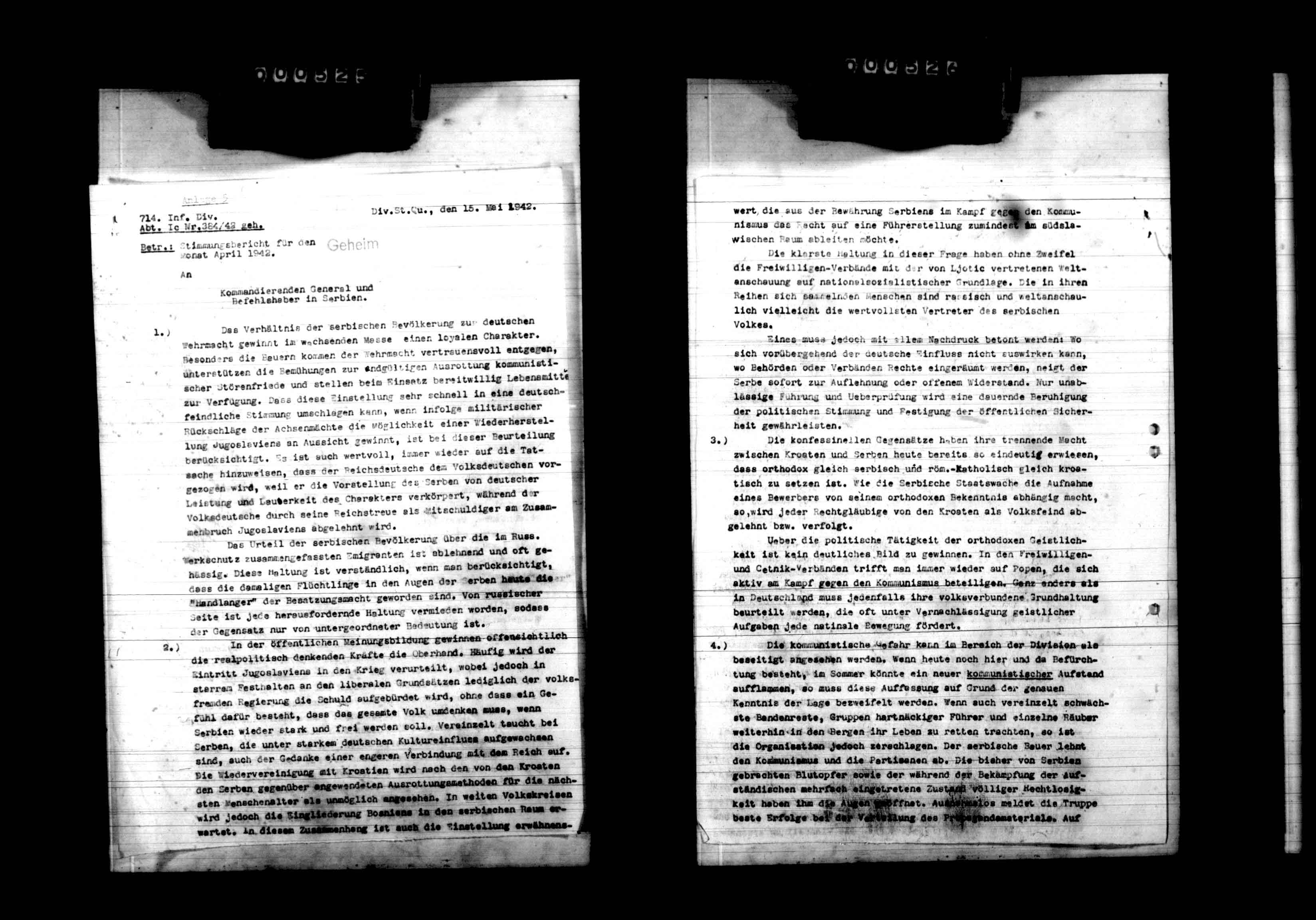 la, Ic, Ila/b, TB mit Anlagen, 714.ID - 27960/4, Activity report of the operations branch concerning the political and military situation in Serbia; control of Chetnik and other volunteer units; operations against partisans, including a chronological presentation of these operations with data on enemy losses, 4-29 Apr 1942; training, troop indoctrination and entertainment, and regrouping in the Topola, Obrenovac, Mitrovica, Valjevo, Cacak, Natalinci, Loznica, Sabac, and Uzice areas; and an activity report of the personnel branch regarding personnel assignments, transfer, and strength. Intelligence reports pertaining tc the morale, attitude, and the military, political, and economic situation of civilians and partisan groups in Yugoslavia and reconnaissance operations in the Velja Glava area, 11 Apr; a register of officers; casualty lists; combat and ration strength reports for Mar and Apr 1942; and maps showing the location of division units,, April 01, 1942 - April 30, 1942 izdvojeno: | 496 |
