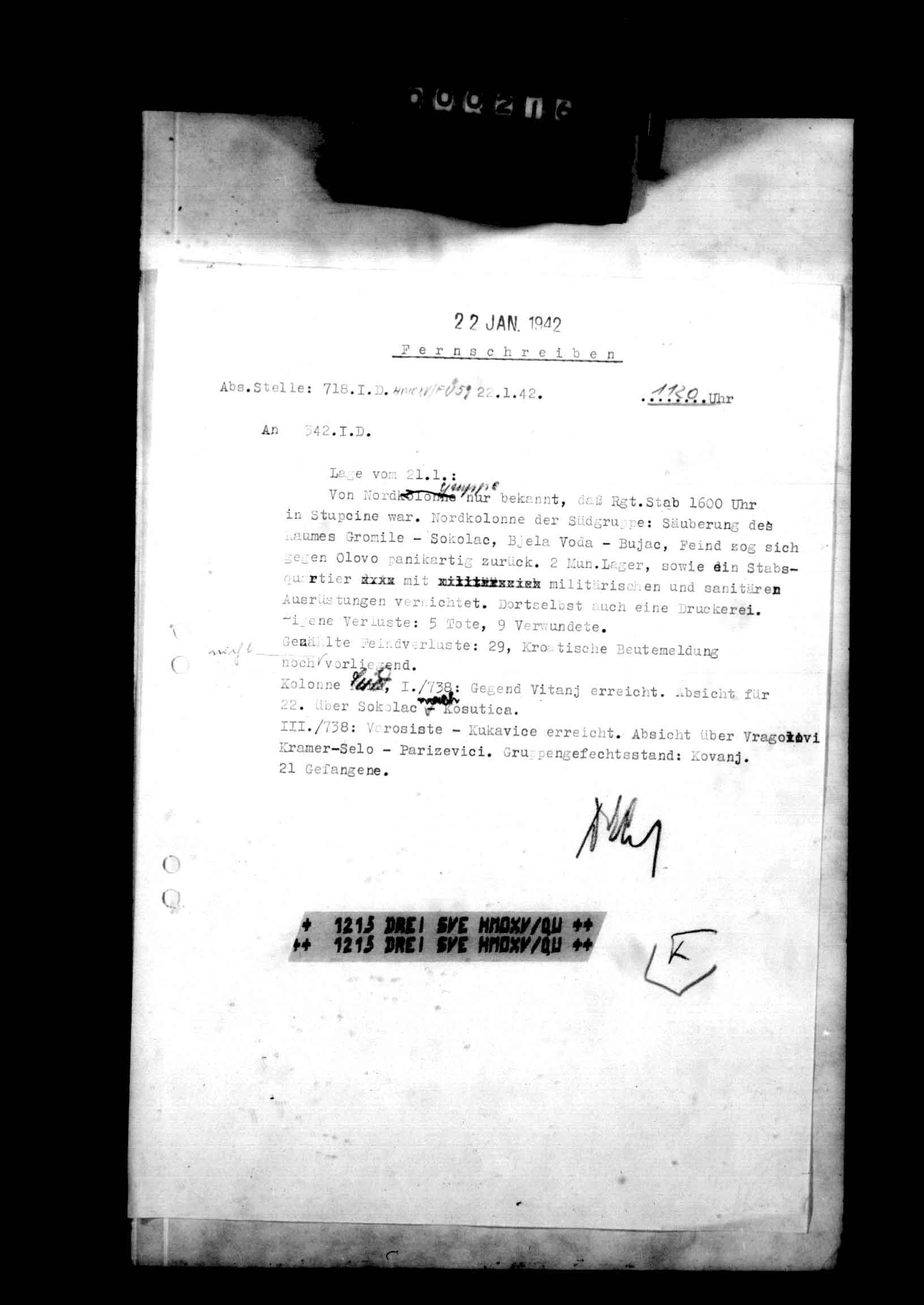 28326/3 - 718 Inf Div. Ia, Anlagenband X zum Kriegstagebuch Nr. 2. Anlagen 585/2 - Annexes to War Diary Nr. 2. Reports relating to unit occupation duty and antipartisan warfare in Yugoslavia., January 13, 1942 - January 25, 1942