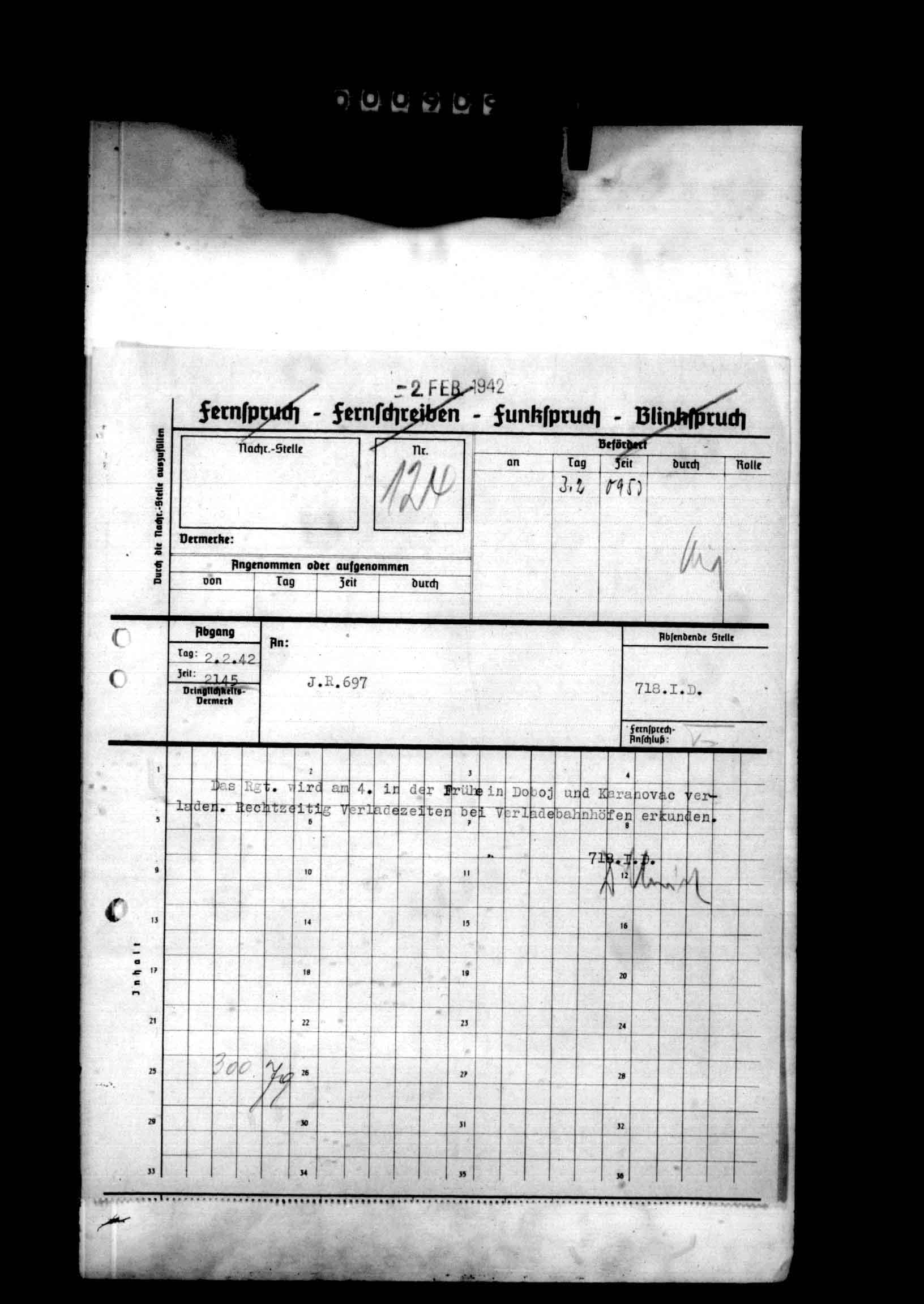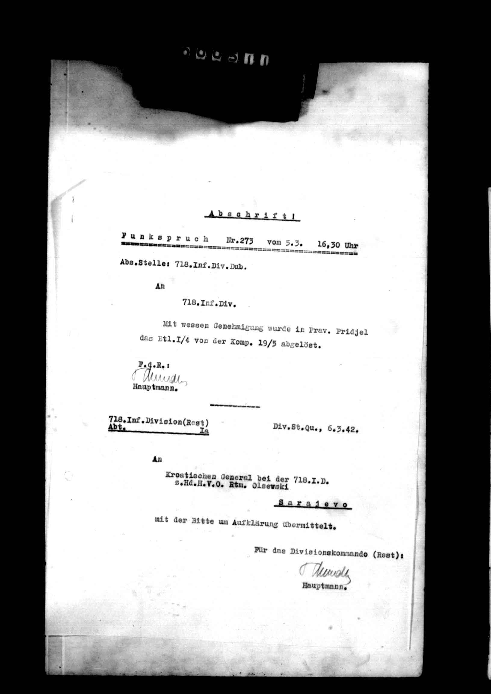28326/4 - 718 Inf Div. Ia, Anlagenband XI zum Kriegstagebuch Nr. 2. Anlagen 584-700 - Annexes to War Diary Nr. 2. Reports relating to unit occupation duty and antipartisan warfare in Yugoslavia., January 01, 1942 - March 19, 1942