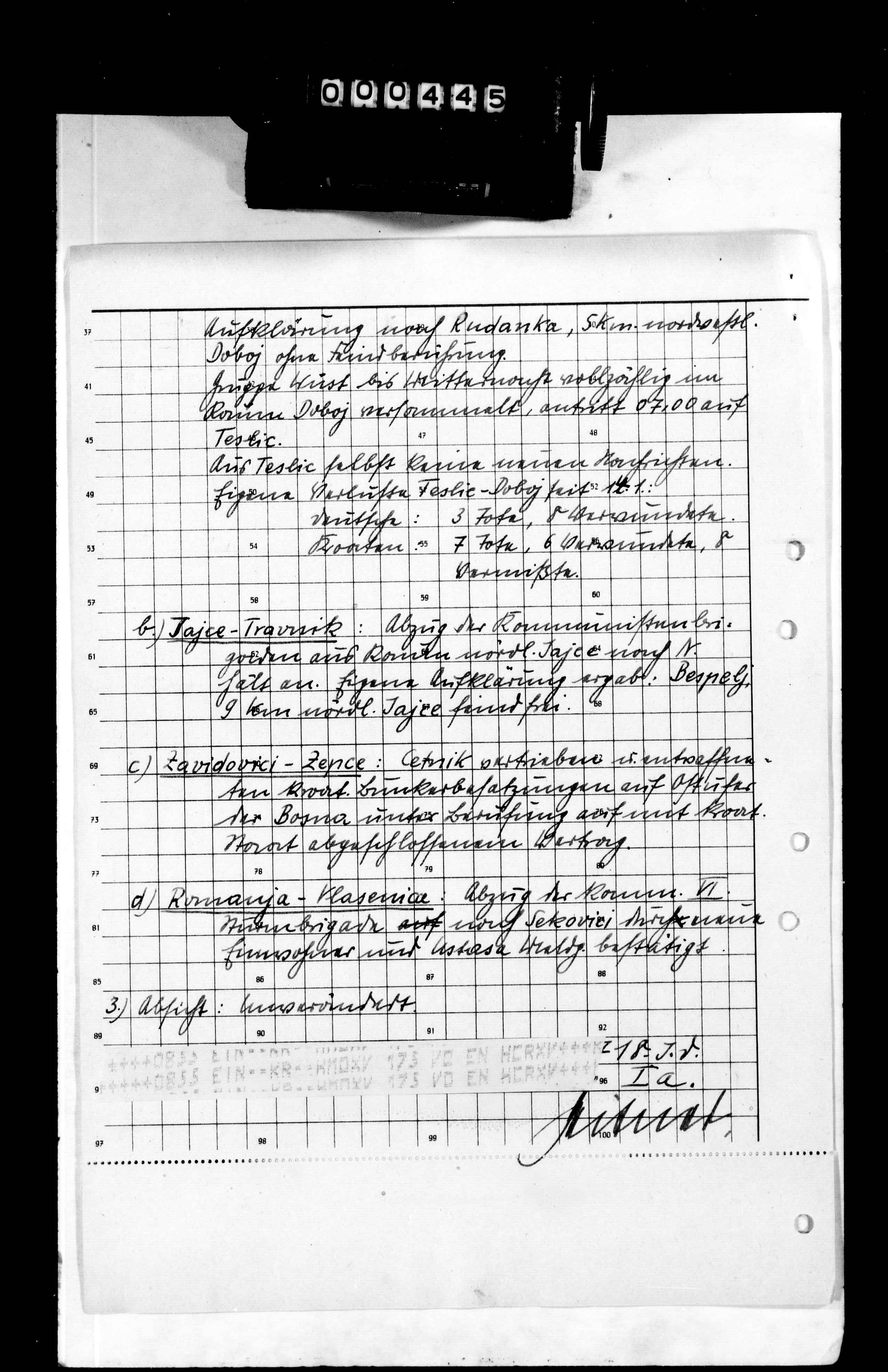 34404/1 - Ia, KTB 3. - War journal concerning operations against partisans, mopping-up action, security, training, regrouping, daily division losses, aad partisan activity in the Jajce, Travnik, Sarajevo, Zepce, Turbe, Visegrad, Senica, Tuzla, Kladanj, Derveata, Donji Vakuf, Zvornik, Olovo, Trnovo, Prozor, Tarcin, Mostar, and Kiseljak areas. Jan 01 - Mar 31, 1943., January 01, 1943 - March 31, 1943 izdvojeno: | 177 |