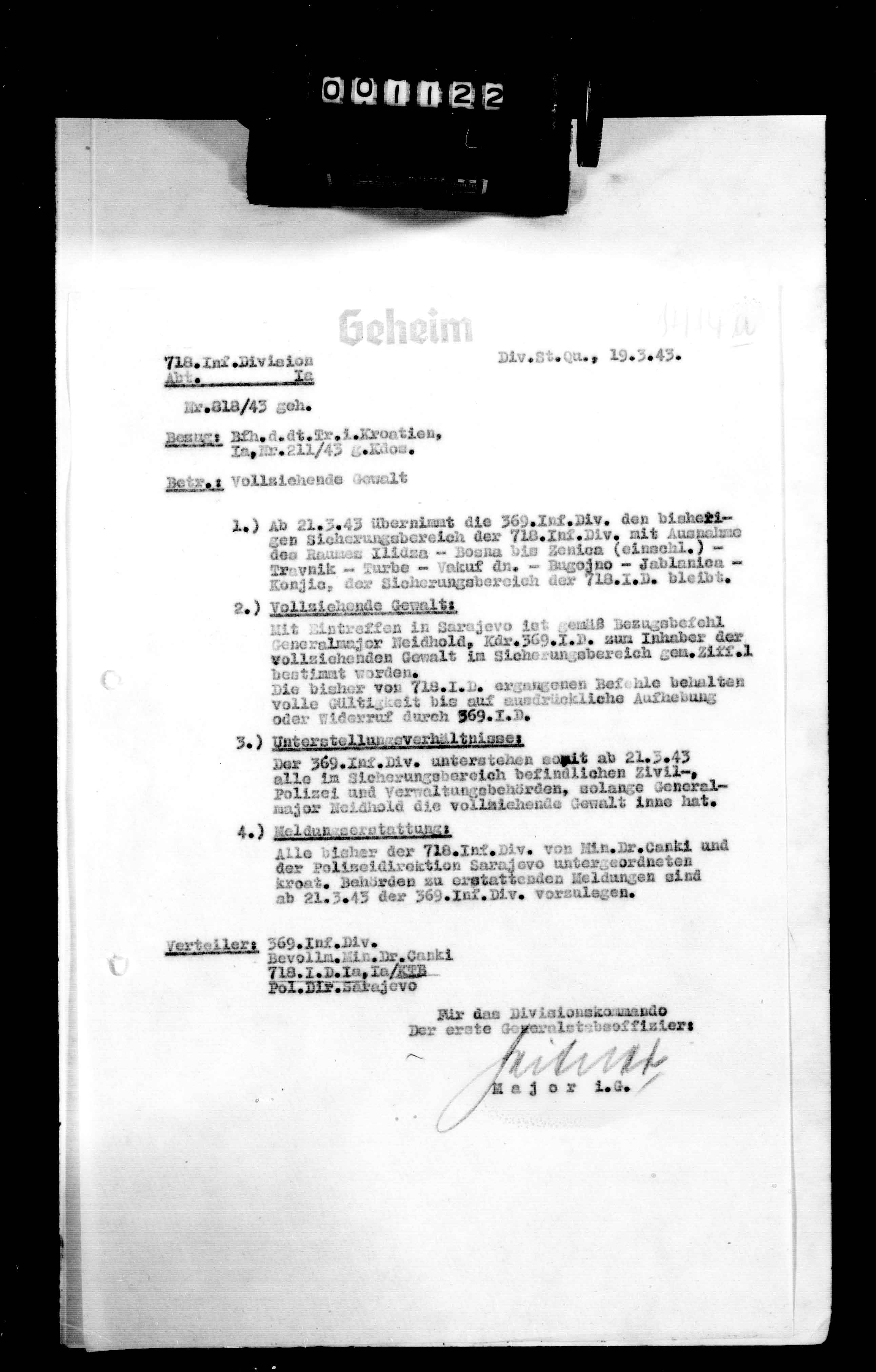 34404/4 - Ia, Anlagenband XXVIII zum KTB 3. - Orders, reports, messages, and maps pertaining to operations against partisans, mopping-up action, security, training, regrouping, and partisan activity, unit identification, location, and strength in the Konjic, Kiseljak, Sarajevo, Mostar, Travnik, Zenica, Doboj, Rogatica, Vlasenica, Zavidovici, Tuzla, Jajce, Vares, Prozor, Visoko, Busovaca, and Teslic areas; reorganization and training as the 718. Jaeger-Division in March 1943 and redesignation as the 118. Jaeger-Division, 1 Apr. Reports concerning the political, partisan, German military, traffic, economic, health, and replacement situation; condition of roads and railroads; and civilian morale and attitude in the division sector. Lists of division and enemy losses, acts of sabotage, and units subordinate to the division as of 31 Mar. A billeting survey of the Croatian 4th Jaeger-Brigade, 22 Mar; and an afteraction report by Gren.Rgt. 738 regarding Unternehmen Mostar (operations against partisans in the Gornji Vakaf, Prozor, Podhum, Ostrozac, and Jablanica areas to secure the bauxite mining region around Mostar, 23 Feb-19 Mar). Mar 01 - Mar 31, 1943., March 01, 1943 - March 31, 1943 izdvojeno: | 947 |