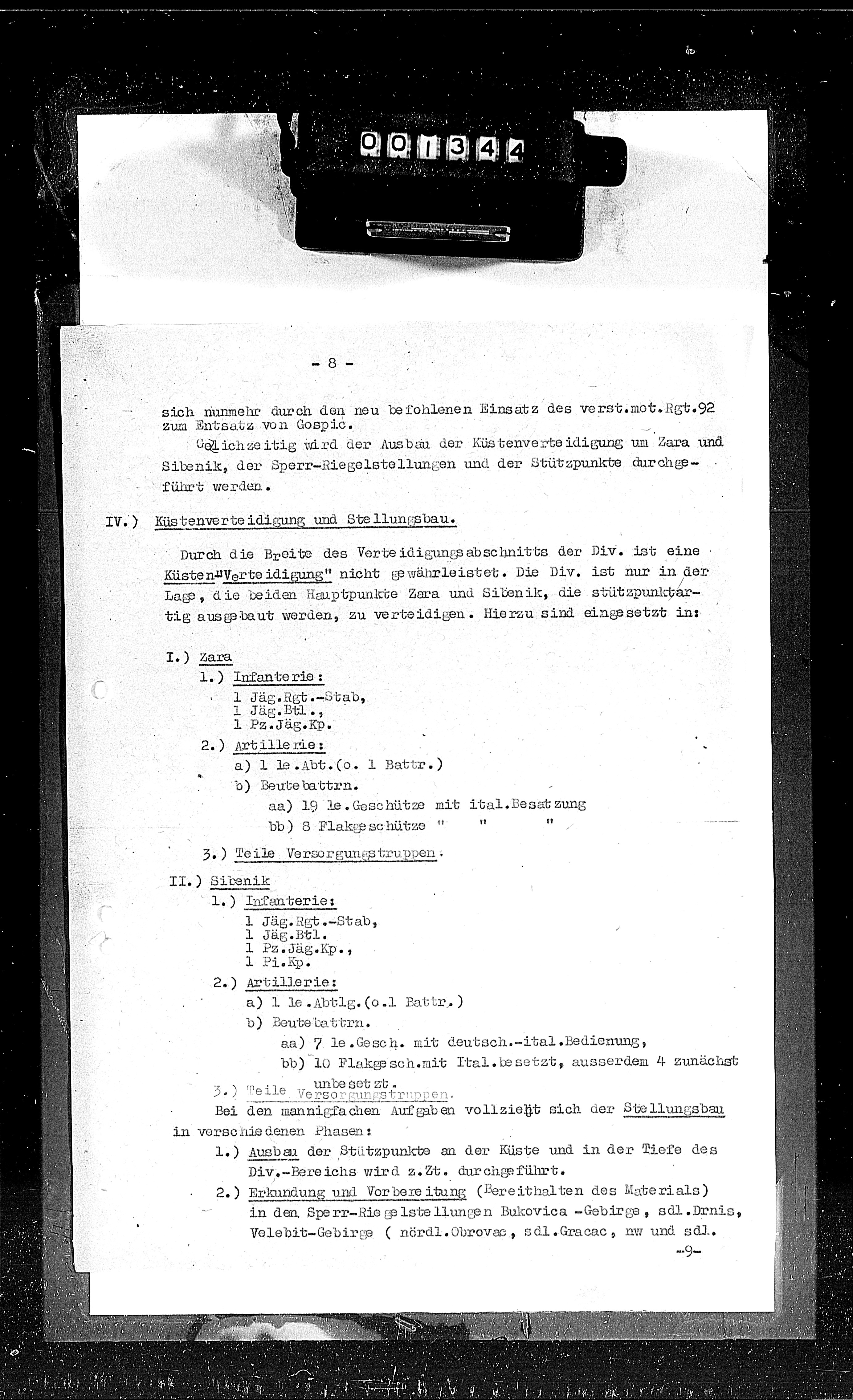 - 9.9. 114.Jäg.Div. entwaffnet nach anfänglich geringem Widerstand 45oo Italiener in KNIN. 10.9. 114.Jäg.Div. ZARA besetzt. VI. ital. A. K. im Raum Ragusa nach Stuka-einsatz und konzentrischem Angriff verhandlungsbereit. Verhandlung deutscherseits abgelehnt und bedingungslose . Kapitulation verlangt, andernfalls Fortsetzung Stukaangriff. Hierauf Kapitulation... 11.9. SIBENIK kampflos besetzt, 6-8000 Italiener. RAGUSA besetzt. Auf SINJ angesetztes verst. Btl. trifft auf starken Bandenwiderstand.