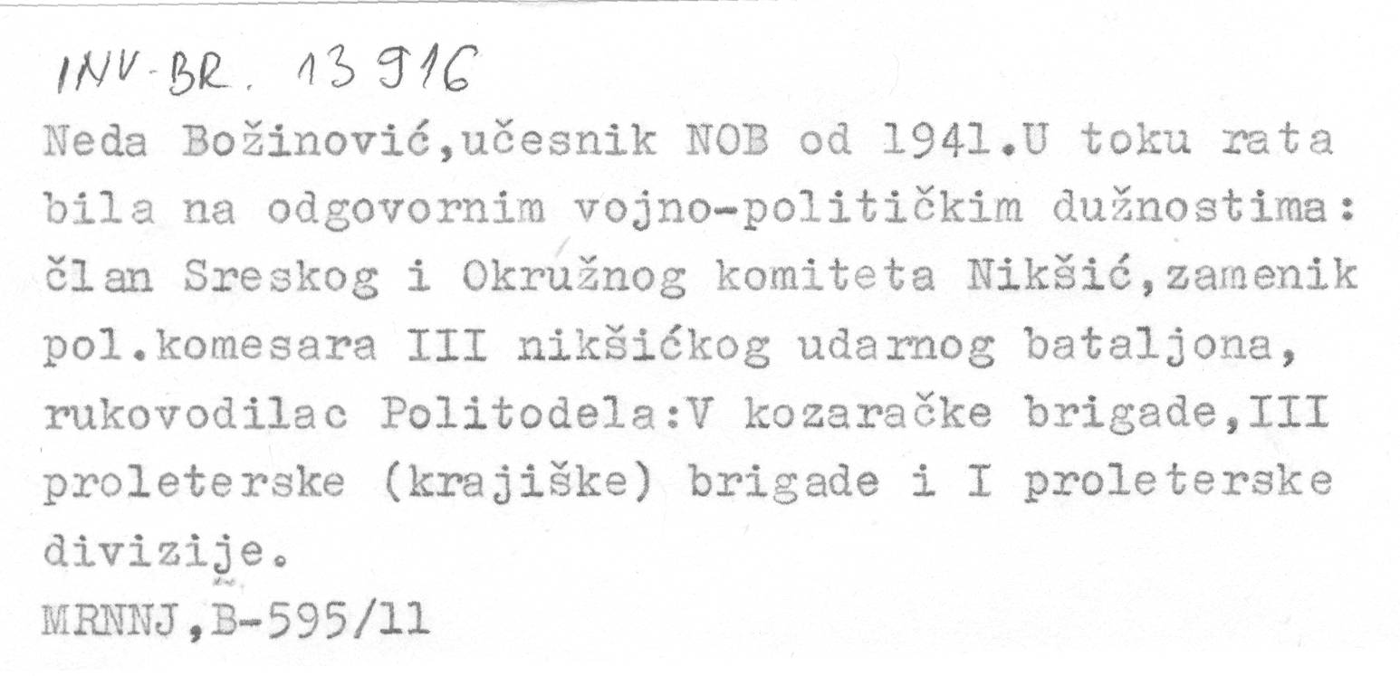 Neda Božinović,učesnik NOB od 1941.U toku rata bila na odgovornim vojno-političkim dužnostima:…