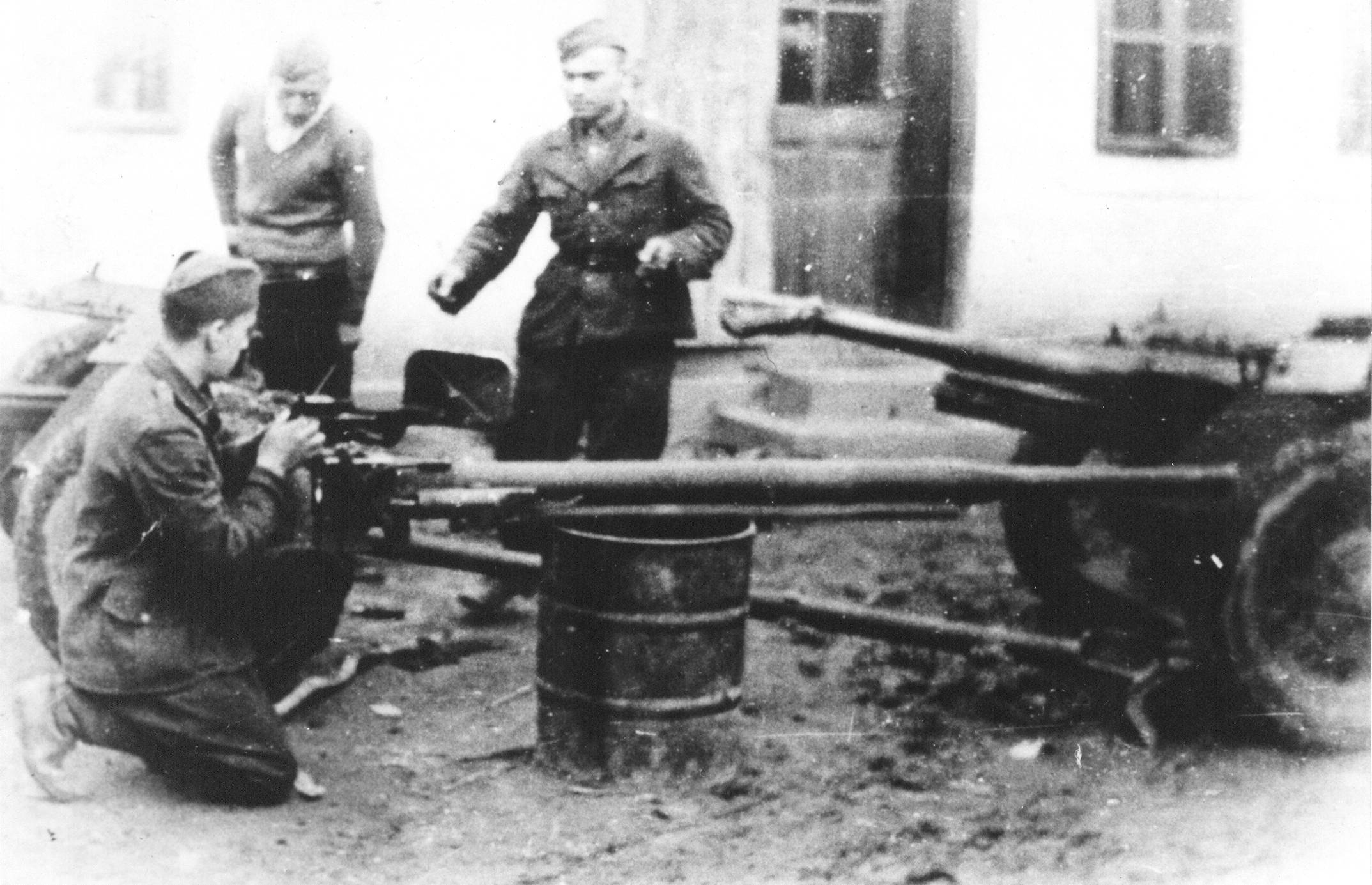 Opravka protivtenkovskih topova u puškarskoj radionici Prve proleterske brigade u Kukujevcima 24.…
