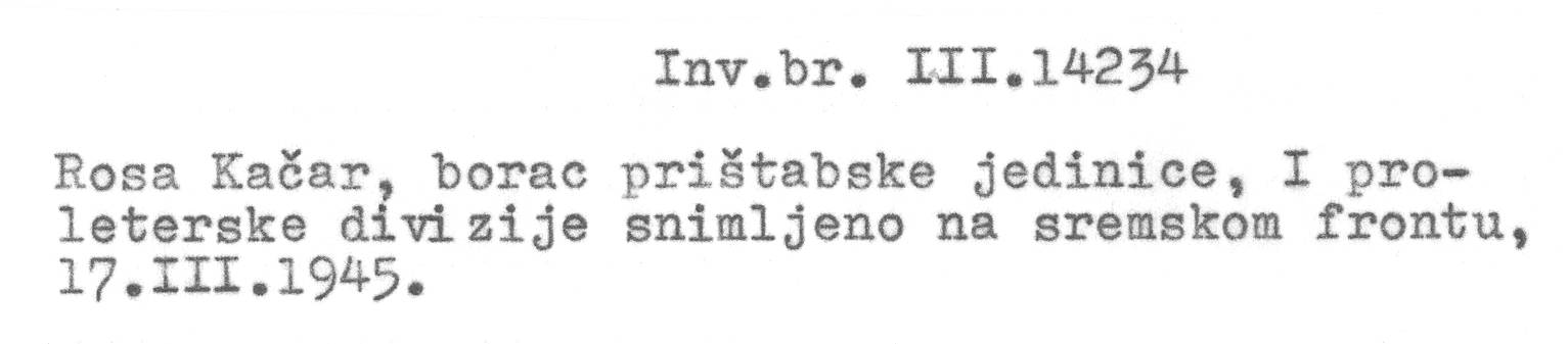 Rosa Kačar, borac prištapske jedinice I proleterske divizije. Snimljeno na sremskom frontu, 17.III…