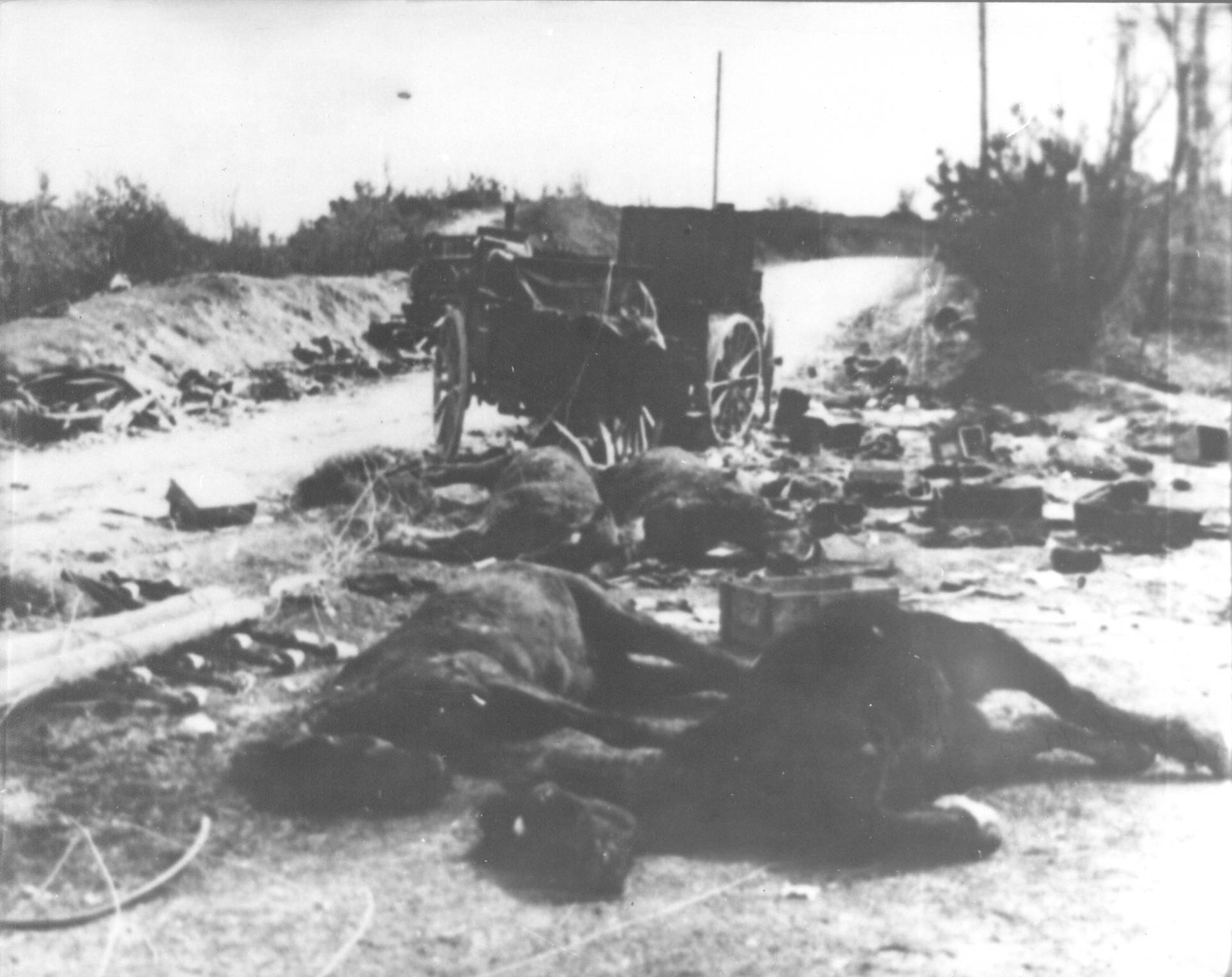 Oštećeri i uništeni nemački tenkovi, topovi i vojna oprema sa leševima posle borbi severno od…